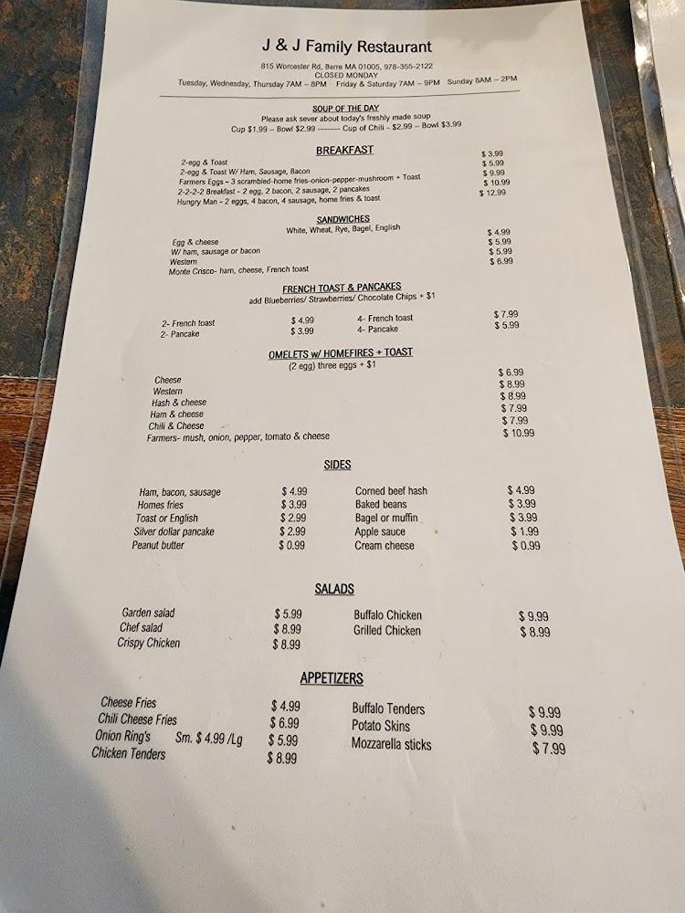 Welcome to J&J Family Restaurant LLC, a locally owned gem in Barre, MA, serving delicious homemade meals for over five years. Our cozy, family-friendly atmosphere makes it the perfect spot for breakfast, lunch, or dinner, whether dining solo or with a group. We pride ourselves on offering excellent local specialties and irresistible desserts. Enjoy a range of options from healthy bites to comforting classics. With accessible seating and convenient takeout and delivery services, we cater to everyone. Stop by and experience our welcoming ambiance and delightful menu that will surely satisfy your cravings!